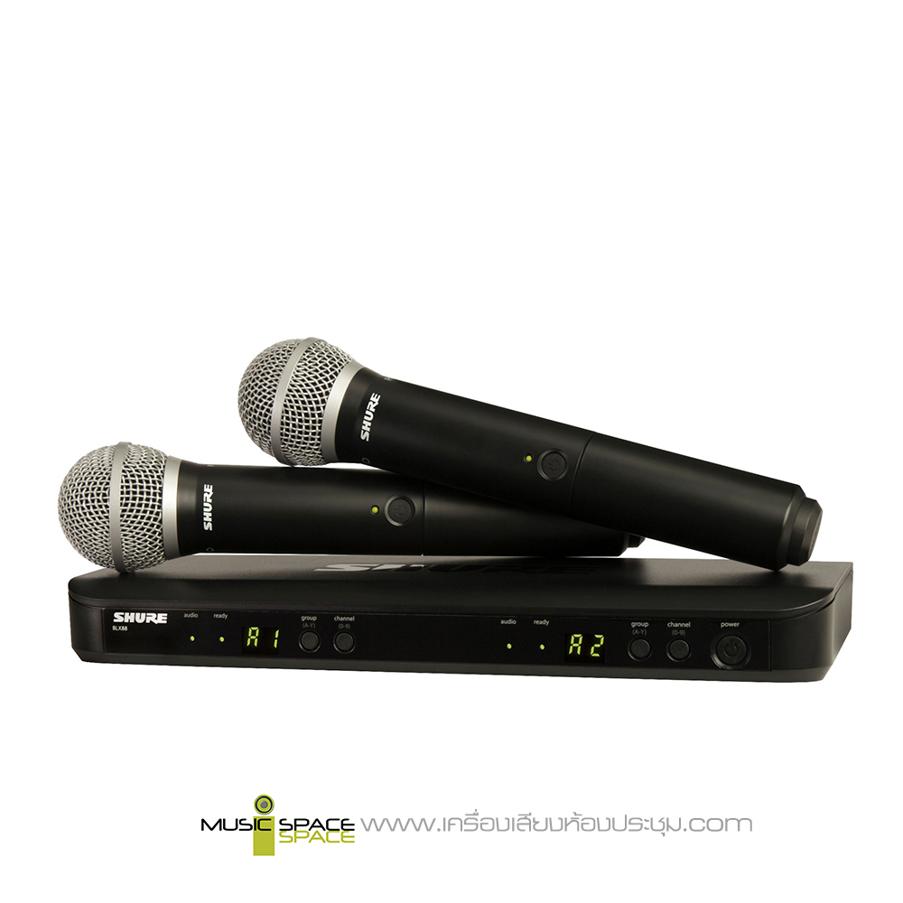 ไมโครโฟนไร้สายแบบมือถือคู่ 2 ไมค์ เป็นคลื่นความถี่ใหม่ที่ถูกต้องตามข้อกำหนดของ กสทช (694-703MHz) ประกอบด้วย เครื่องรับสัญญาณไมค์ BLX88 dual wireless receiver เครื่องส่งสัญญาณ BLX2/PG58 ไมโครโฟนไร้สาย SHURE หัวไมค์รุ่น PG58 2 ตัว