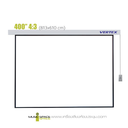 จอรับภาพโปรเจคเตอร์แบบมอเตอร์ไฟฟ้า VERTEX ขนาดเส้นทะแยงมุม(Diagonal) 400 นิ้ว อัตราส่วน 4:3 โดยมีขนาดพื้นที่ฉายความยาว และความสูงของจอ 320×240 นิ้ว หรือ 813×610 เซ็นติเมตร เนื้อจอรับภาพ (Fabric) แบบ Matt White